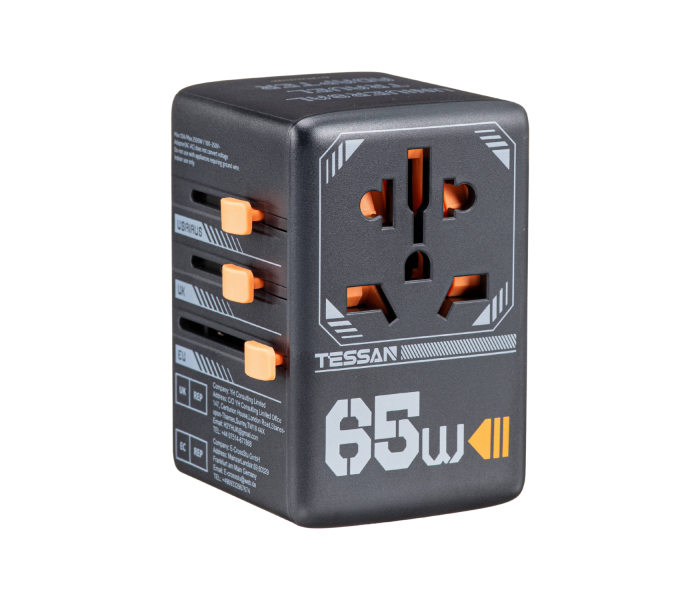 The TESSAN TS-WTA03 is a 65W universal travel adapter with GaN technology, featuring one universal AC outlet and four USB ports (two USB-A and two USB-C).
